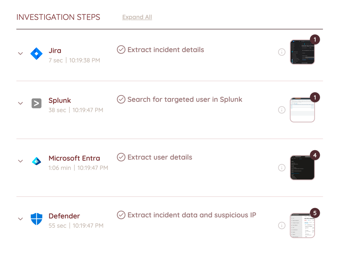 By the time an analyst opens the case, the full evidence gallery is already there. Screenshots organized sequentially, labeled by tool, timestamped, and ready to review. Not just a summary. Not just a log. The complete picture: the analysis and the visual evidence behind every conclusion.